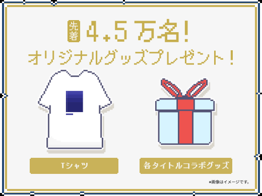 各タイトルとコラボをした、Google Play 大感謝祭限定 T シャツやオリジナルグッズを先着 4.5 万名様にプレゼント!