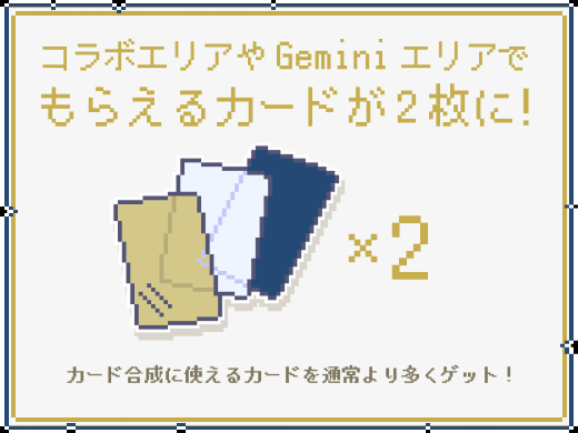 ダイヤモンド・プラチナ会員の方は、コラボエリアや Gemini エリアでもらえるカードパーツを一度に 2 枚獲得できます!たくさんのパーツを集めて、自分だけのカードを作りましょう!